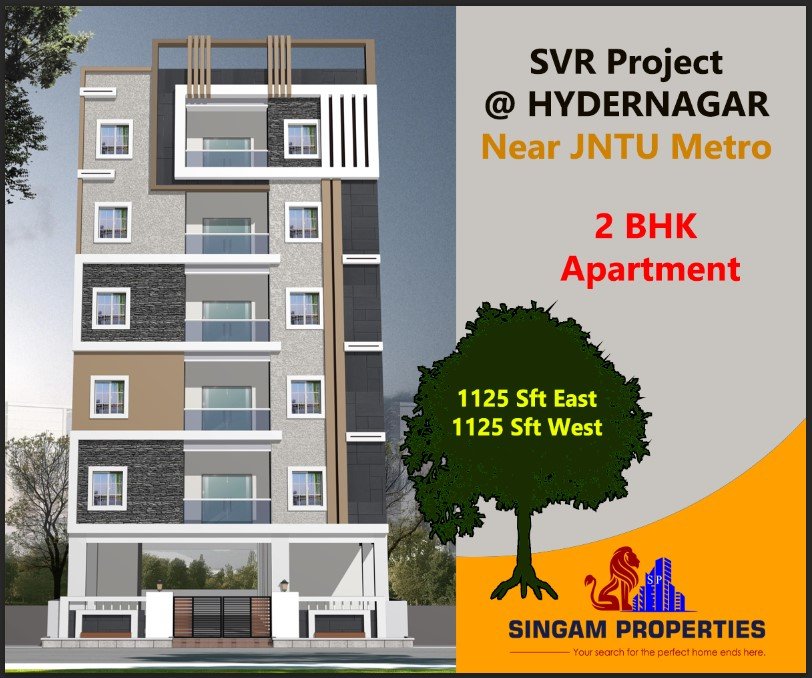 The SVR Project in Hydernagar near KPHB, Hyderabad, offers 2BHK apartments designed for comfortable living, ideal for families seeking a happy home. These apartments provide modern amenities, convenient location, and a community-focused environment, making them a suitable choice for those looking to settle in Hyderabad. For detailed pricing, availability, and additional features, it’s best to contact the Singam Properties.